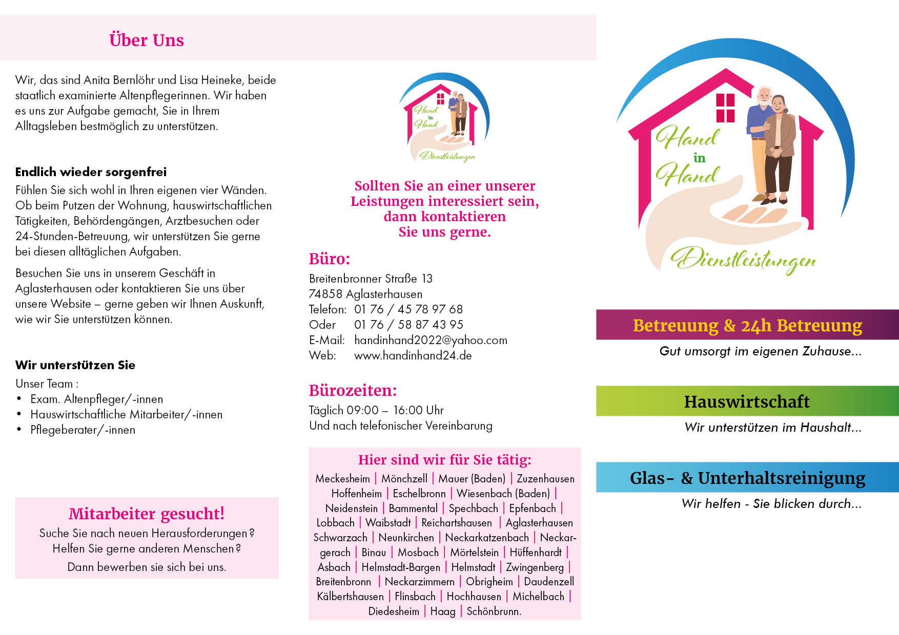 Fühlen Sie sich wohl in Ihren eigenen vier Wänden. Ob beim Putzen der Wohnung, hauswirtschaftlichen Tätigkeiten, Behördengängen, Arztbesuchen oder Pflege, wir unterstützen Sie gerne bei diesen alltäglichen Aufgaben. Besuchen Sie uns in unserem Geschäft in Meckesheim oder kontaktieren Sie uns über unsere Website – gerne geben wir Ihnen Auskunft, wie wir Sie unterstützen können.